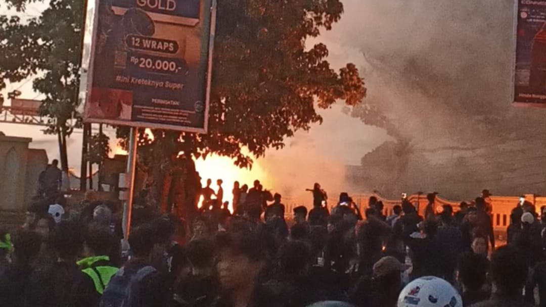 Ketegangan meningkat menjelang waktu magrib, ketika massa mulai membakar pembatas jalan. Teriakan desakan agar Kapolda dan Gubernur datang ke lokasi semakin nyaring terdengar.