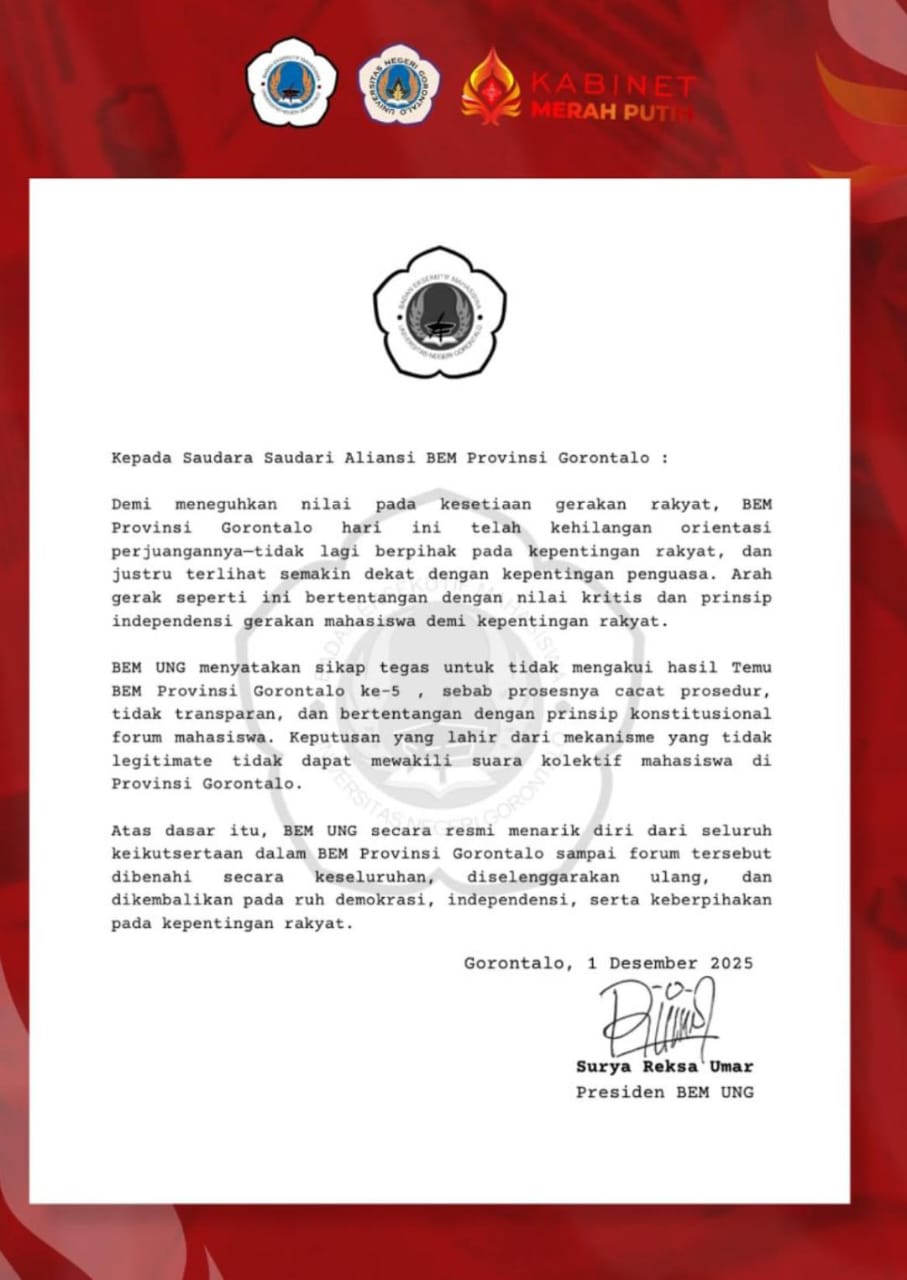 Pernyataan resmi itu ditandatangani Surya Reksa Umar selaku Presiden BEM UNG di Gorontalo, pada 1 Desember 2025.