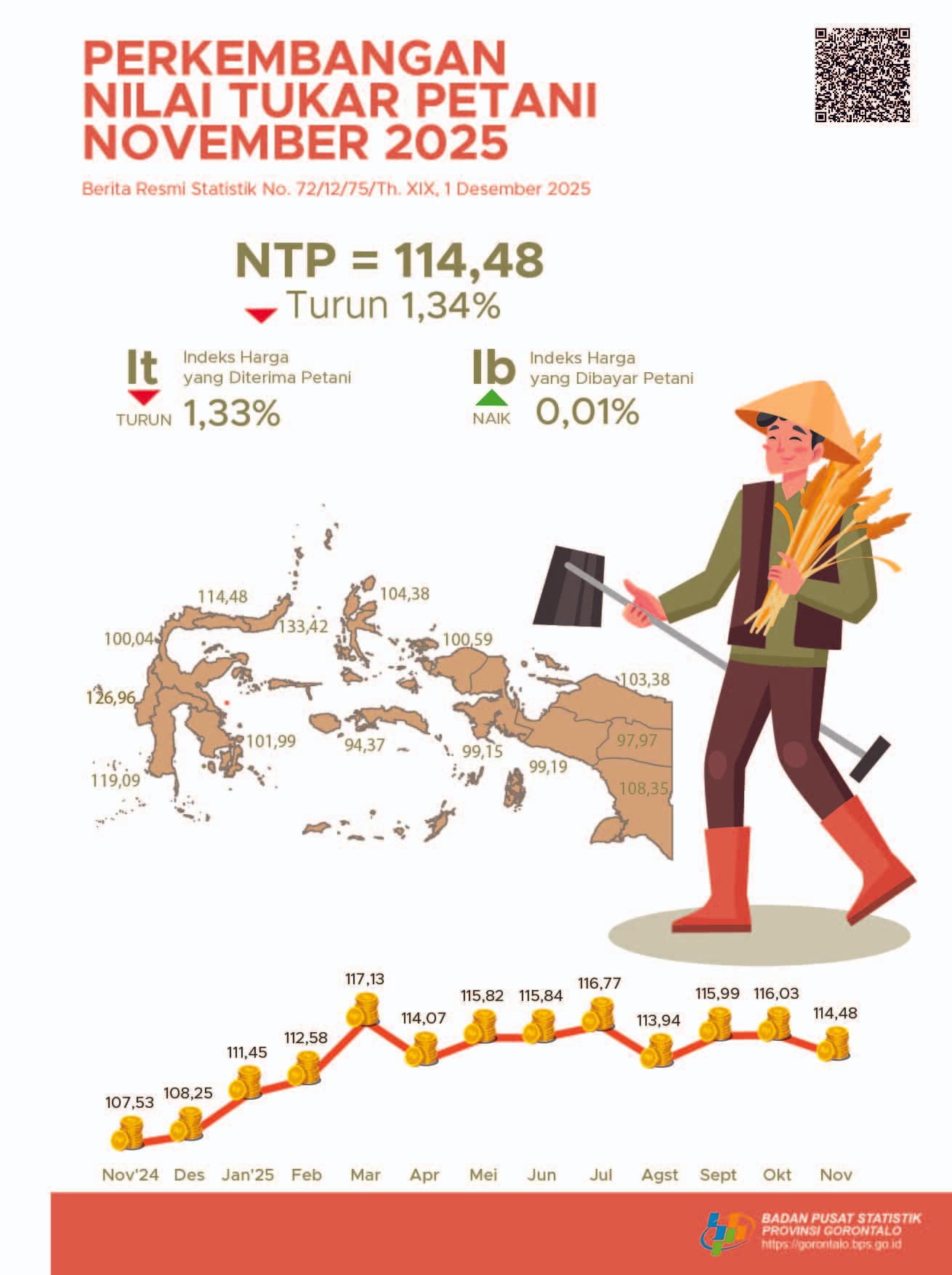 Tabayyun.co.id, GORONTALO — Badan Pusat Statistik (BPS) Provinsi Gorontalo mencatat Nilai Tukar Petani (NTP) pada November 2025 berada di angka 114,48, turun 1,34 persen dibandingkan bulan sebelumnya. Informasi tersebut disampaikan melalui rilis resmi pada 1 Desember 2025.
