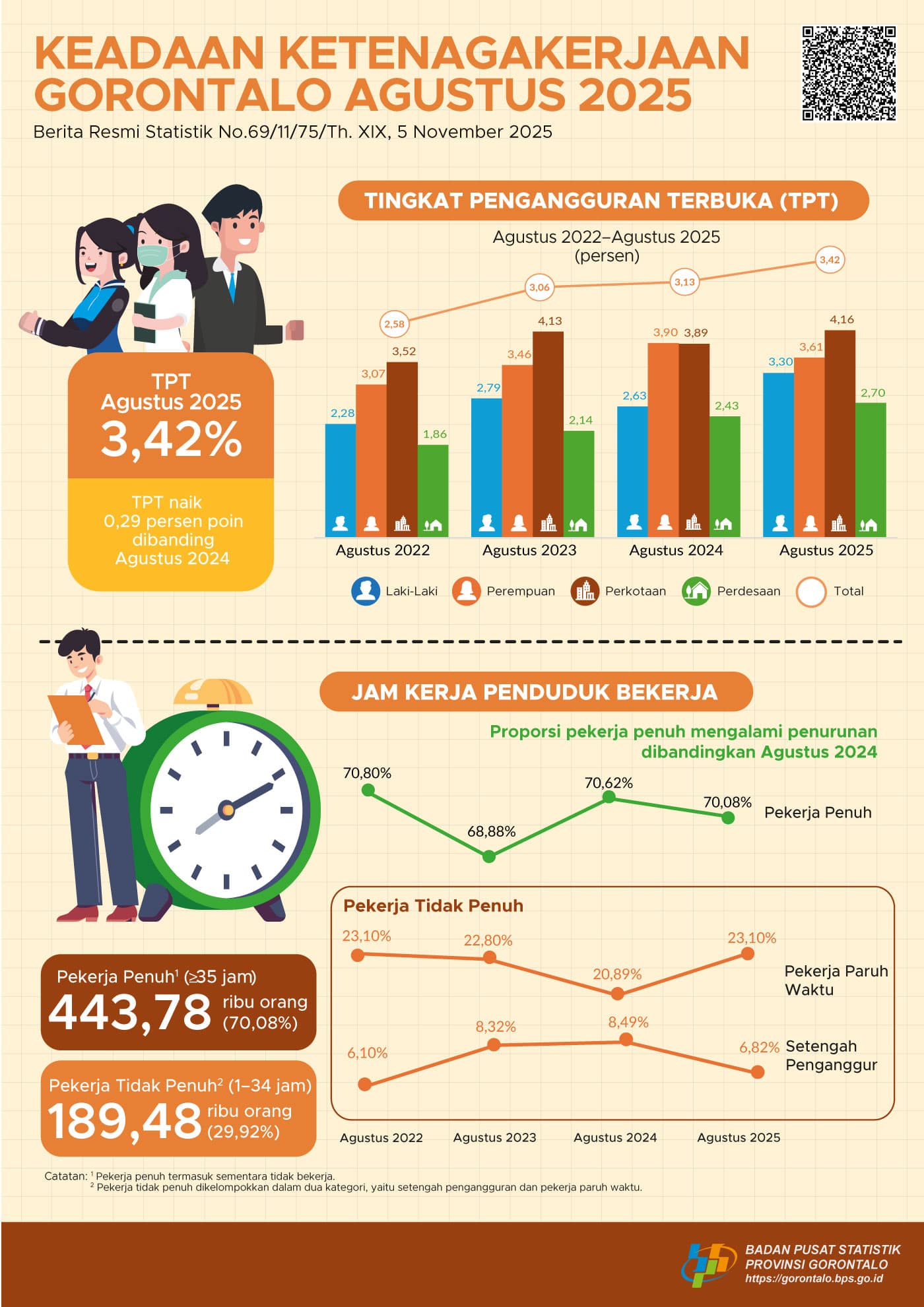 Tabayyun.co.id, GORONTALO — Badan Pusat Statistik (BPS) Provinsi Gorontalo mencatat tingkat pengangguran terbuka (TPT) pada Agustus 2025 mencapai 3,42 persen, atau naik 0,29 persen poin dibanding periode yang sama tahun sebelumnya.