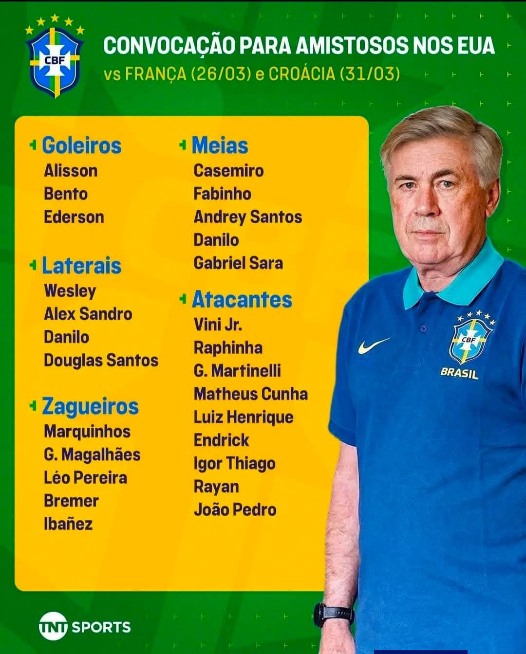 Brasil dijadwalkan melakoni dua laga persahabatan menghadapi Timnas Prancis di Boston pada 26 Maret dan Timnas Kroasia di Orlando pada 31 Maret. Dua pertandingan ini menjadi momen terakhir sebelum pelatih Carlo Ancelotti menetapkan skuad final.