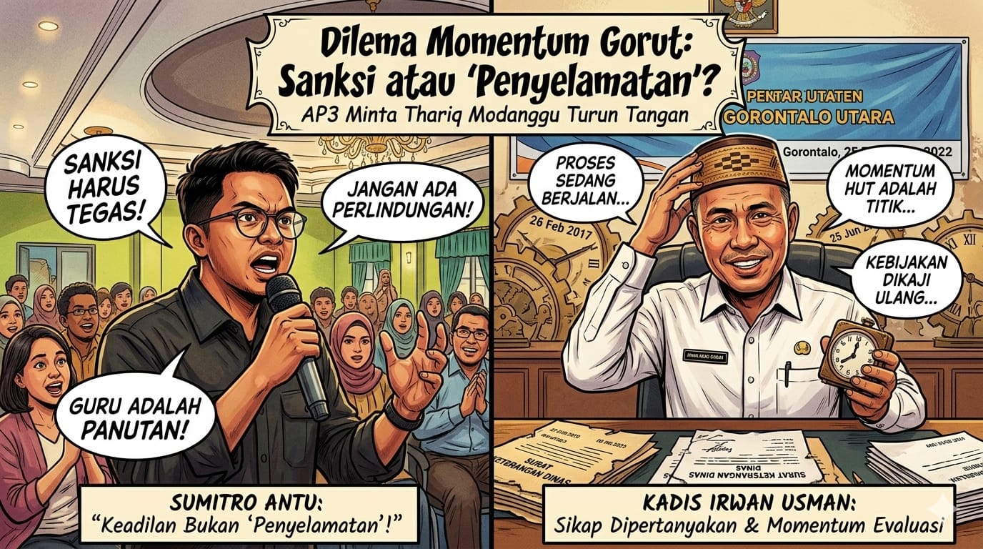 Tabayyun.co.id, GORONTALO UTARA – Aliansi Pemuda Peduli Pendidikan (AP3) Gorontalo Utara melontarkan kritik keras terhadap kebijakan Kepala Dinas Pendidikan Kabupaten Gorontalo Utara, Irwan Abudi Usman, yang menjatuhkan sanksi kepada oknum guru, Yibsan Baid, atas dugaan pelanggaran kode etik Aparatur Sipil Negara (ASN).