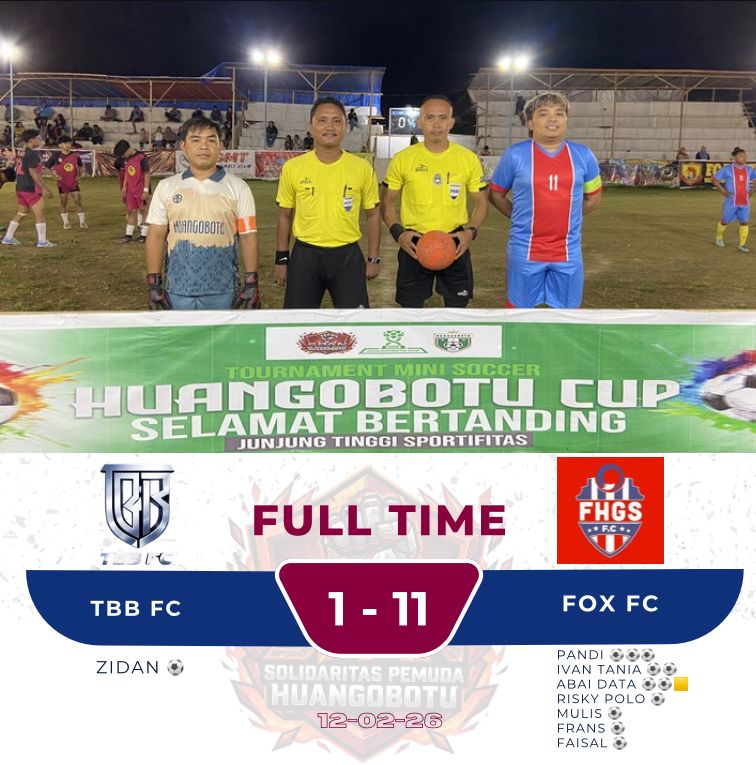 Tabayyun.co.id, OLAHRAGA,GORONTALO -Tim sepak bola FOX FC tampil trengginas dalam lanjutan turnamen Huangobotu Cup di Gorontalo, Kamis, 13 Februari 2026. Menghadapi TBB FC, FOX FC menutup pertandingan dengan kemenangan telak 11-1.