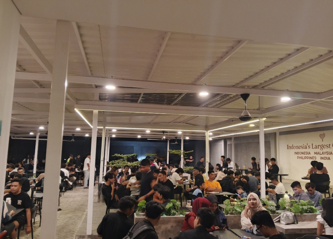 Kursi di area indoor terisi penuh hanya dalam waktu singkat. Di bagian luar, kelompok anak muda tampak menikmati atmosfer malam Ramadhan sambil berbincang santai.