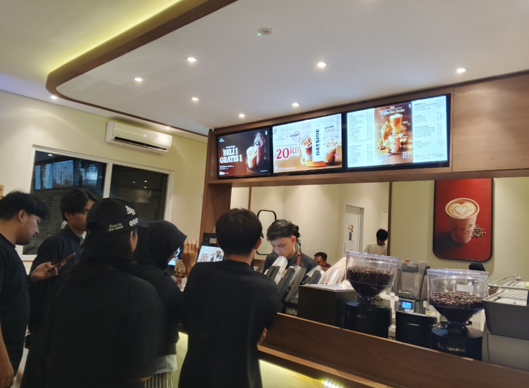 Ramainya pelanggan menyebabkan antrean di kasir memanjang. Para barista terlihat sigap melayani pesanan minuman yang terus berdatangan.