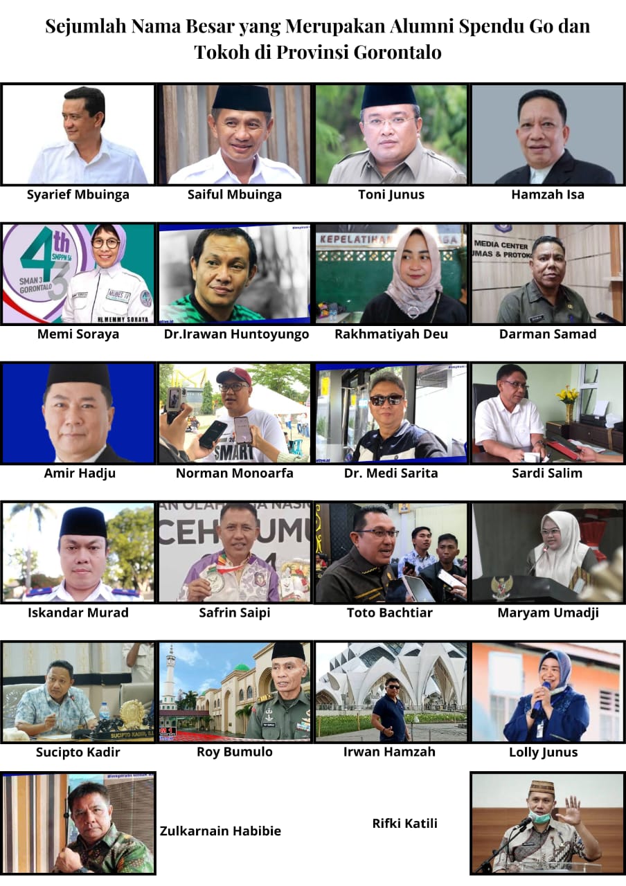 Nama-nama tokoh asal Gorontalo yang pernah menimba ilmu di Spendu Go mulai ramai dibicarakan. Mereka antara lain Saiful A Mbuinga,Toni Junus, Hamzah Isa, Memi Soraya, Dr. Irawan Huntoyungo, Rakhmatiyah Deu, Darman Samad, Amir Hadju, Norman Monoarfa, Dr. Medi Sarita, Sardi Salim, Iskandar Murad, Safrin Saipi, Totok Bachtiar, Maryam Umadji, Sucipto Kadir, Roy Bumulo, Irwan Hamzah, Lolly Yunus, Zulkarnain Habibie, dan Rifly Katili.