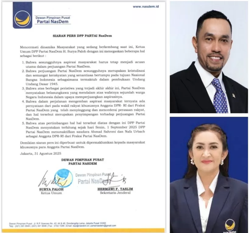 “Bahwa atas pertimbangan hal-hal tersebut di atas dengan ini DPP Partai NasDem menyatakan terhitung sejak hari Senin, 1 September 2025, DPP Partai NasDem menonaktifkan saudara Ahmad Sahroni dan Nafa Urbach sebagai Anggota DPR RI dari Fraksi Partai NasDem,” bunyi pernyataan pada poin kelima siaran pers tersebut.