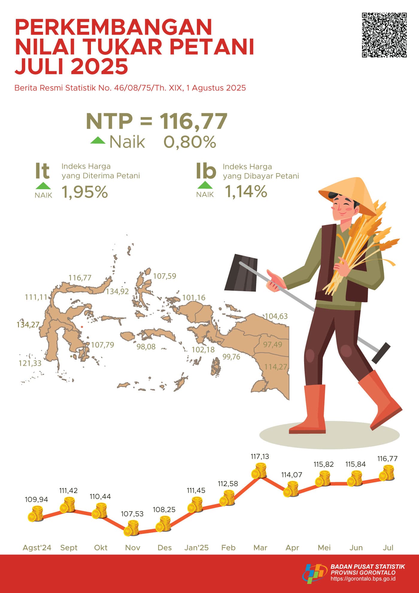 Tabayyun.co.id, GORONTALO, – Kesejahteraan petani di Provinsi Gorontalo menunjukkan tren positif. Pada Juli 2025, Nilai Tukar Petani (NTP) tercatat sebesar 116,77, atau mengalami peningkatan 0,80 persen dibanding bulan sebelumnya.