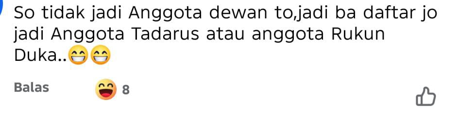 “So tidak jadi Anggota dewan to, jadi ba daftar jo jadi Anggota Tadarus atau anggota Rukun Duka..😁😁,” tulis salah seorang warganet.