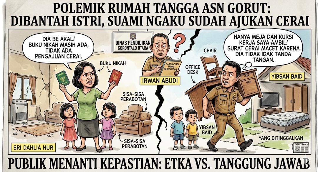 Tabayyun.co.id, GORONTALO UTARA — Polemik rumah tangga yang melibatkan seorang aparatur sipil negara (ASN) di Kabupaten Gorontalo Utara kian memanas. Keterangan yang disampaikan Yibsan Baid kepada Dinas Pendidikan setempat soal pengajuan perceraian dibantah langsung oleh istrinya, Sri Dahlia Nur.