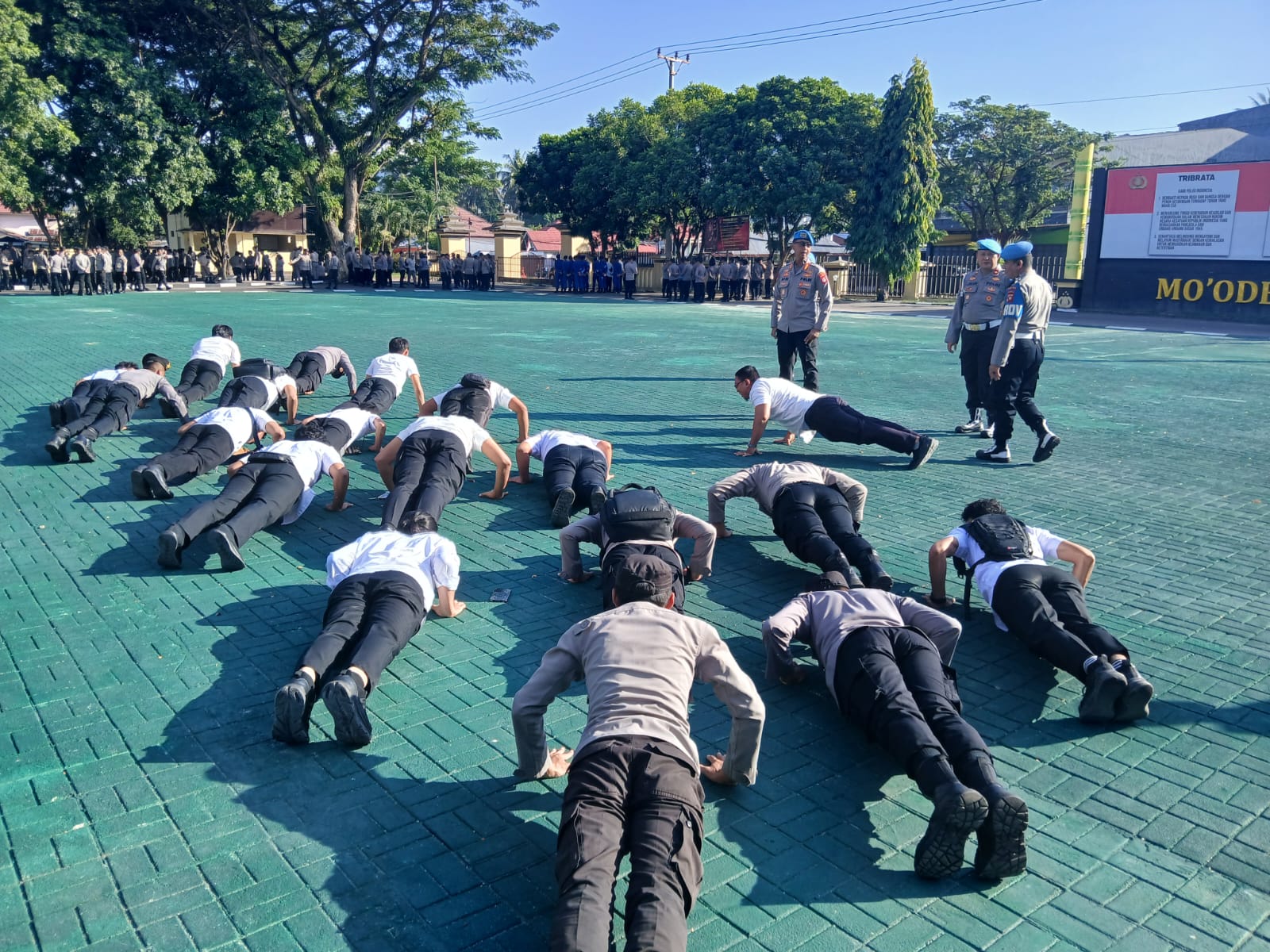 Penegakan disiplin ini dipimpin langsung oleh Kabid Propam Polda Gorontalo, Kombes Pol. Afri Darmawan, S.I.K., M.H., bersama jajaran personelnya. Sebagai bentuk sanksi, para anggota yang datang terlambat diwajibkan menjalani hukuman fisik berupa push-up dan jumping jack.