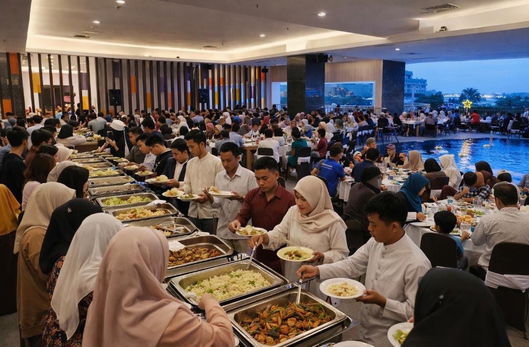 Meja yang disiapkan oleh pihak hotel terlihat hampir seluruhnya terisi. Para pengunjung datang secara berkelompok, mulai dari keluarga, komunitas, hingga rekan kerja yang memanfaatkan momentum Ramadhan untuk mempererat kebersamaan.