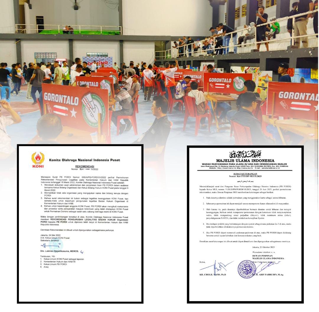 Menindaklanjuti surat dari Pengurus Besar Perkumpulan Olahraga Domino Indonesia (PB PORDI) kepada Ketua MUL, nomor: 51/B.III/PB/PORDI/VI/2025, tanggal 20 Juni 2025, perihal permohonan rekomendasi, maka Dewan Pimpinan MUI memberikan keterangan sebagai berikut: