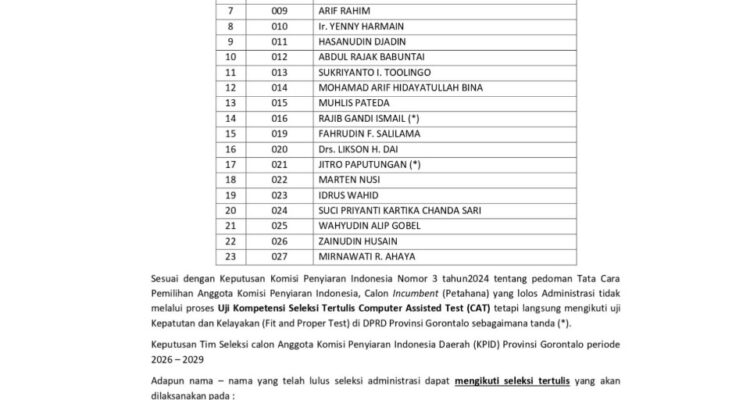 Tabayyun.co.id, GORONTALO- Proses seleksi Calon Anggota Komisi Penyiaran Indonesia Daerah (KPID) Provinsi