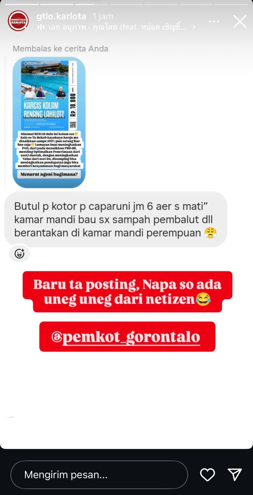 Keluhan itu ramai disampaikan lewat media sosial, salah satunya melalui fitur Instagram Story akun resmi @gorontalokarlota, yang menampilkan berbagai komentar dari warga yang merasa kecewa dengan kondisi kolam.